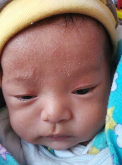 我宝宝额头上长痘痘,又脱皮,一哭脸全变红 宝妈们你们知道这是怎么了吗?怎样才能治好