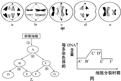 (1)图甲中只有d处于减数第二次分裂,细胞内没有同源染色体.因此含同源染色体的细胞分裂图象有a、b、c、e. (2)由于人的皮肤生发层细胞只能进行有丝分裂,所以只有a、c所示的细胞与其类似;细胞a中着丝点已分裂,每条染色体中含一个DNA分子,而细胞c中的染色体含染色单体,每条染色体中含2个DNA分子,所以DNA数和染色体数之比为2:1的细胞为c细胞. (3)图甲中d细胞内没有同源染色体,且着丝点分裂,处于减数第二次分裂的后期,再加上细胞质均等分裂,所以d细胞是次级精母细胞或第一极体. (4)减数第二次分裂的后期会发生着丝点的分裂,所以乙图的B、C细胞中能发生着丝点的分裂. (5)在减数第一次分裂后期由于同源染色体的分离,导致细胞内染色体数目减半. (6)若卵原细胞的基因组成为Aa,D细胞的基因组成为a,则B细胞的基因组成为aa. (7)丙图代表的含义是细胞中每条染色糕唉虏体上DNA含量的变化,C′D′代表每条染色体上有2个DNA分子,因此可表示有丝分裂的前期、中渐之期,还可以表示减数第一次分裂的全过程及减数第二次分裂的前期和中期,因此基因的分离和自由组合定律均发生在C′D′段. (8)图丙中,D′E′段表示着丝点分裂,姐妹染色单体分离,该段对应着有丝分裂的后期或减数第二次分裂的后期,即甲图中的细胞a、d.故答案为:(1)a、b、c、e(2)a、c;;; ;c(3)次级精母细胞或第剑宰一极体(4)B、C(5)同源染色体分离(6)aa(7)C′D′(8)有丝分裂后期、减Ⅱ分裂后期;;;a、d