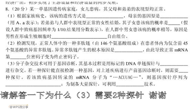 对上述疾病进行产前基因诊断时,则需要种探针 点击展开 匿名用户 2014-01-31 20:11 满意回答 因为致病基因为一段双链DNA,解笼叨旋后为两条互补的单链,因此概逝我们制作的探针就应该为互补的两条,这样加快绣清密探测的几率。 匿名用户 2014-01-31 20:37 宝宝知道提示您:回答为网友贡献,仅供参考。 相关问题 基因诊断明确患者的基因突变位点有重要意义 已知致病位点后对孕妇进行产前诊断可明确胎儿是否携带致病 北京协和医院血友病产前基因诊断 如何购买用于荧光原位杂交产前诊断的探针?哪家公司好?