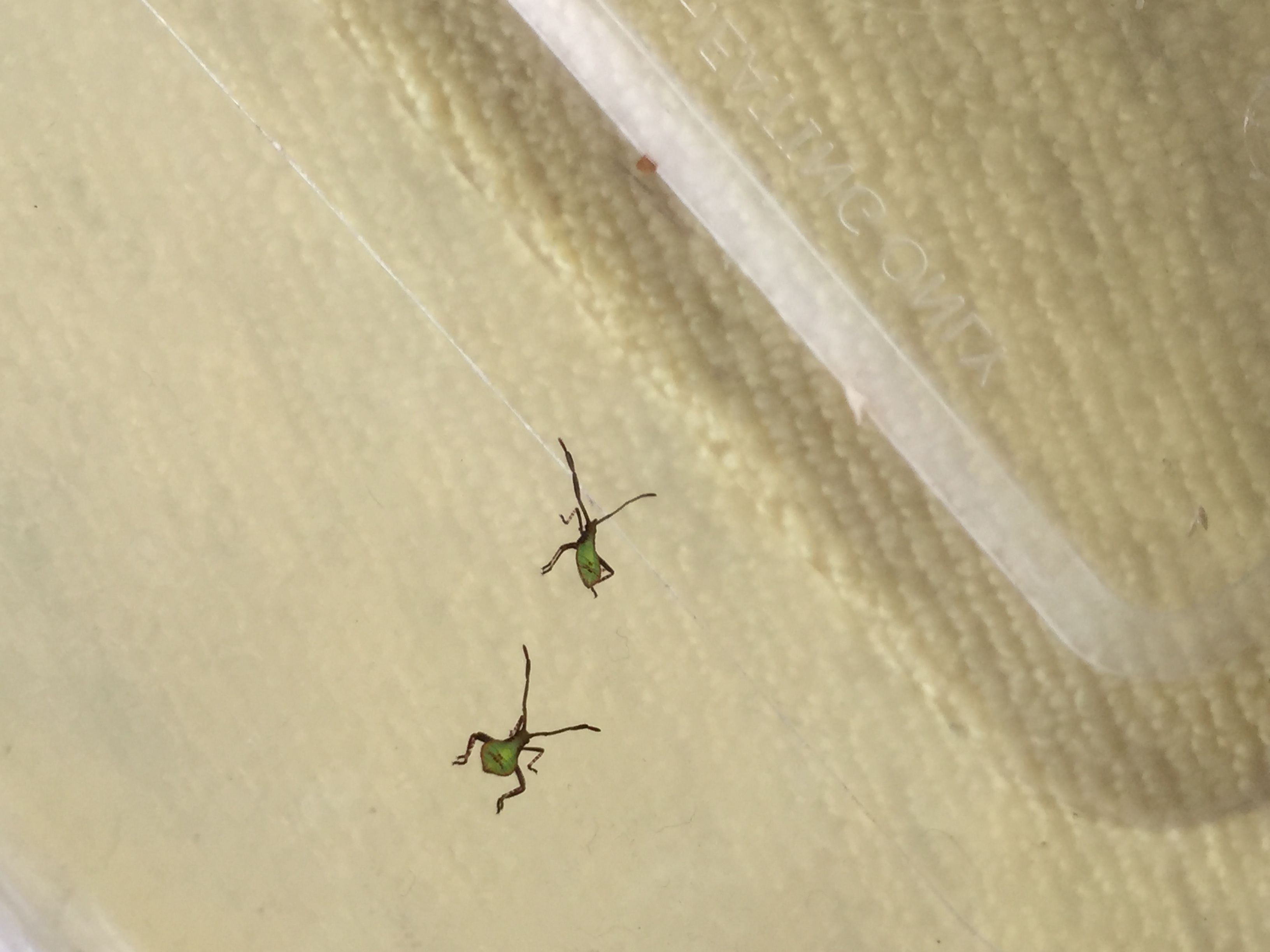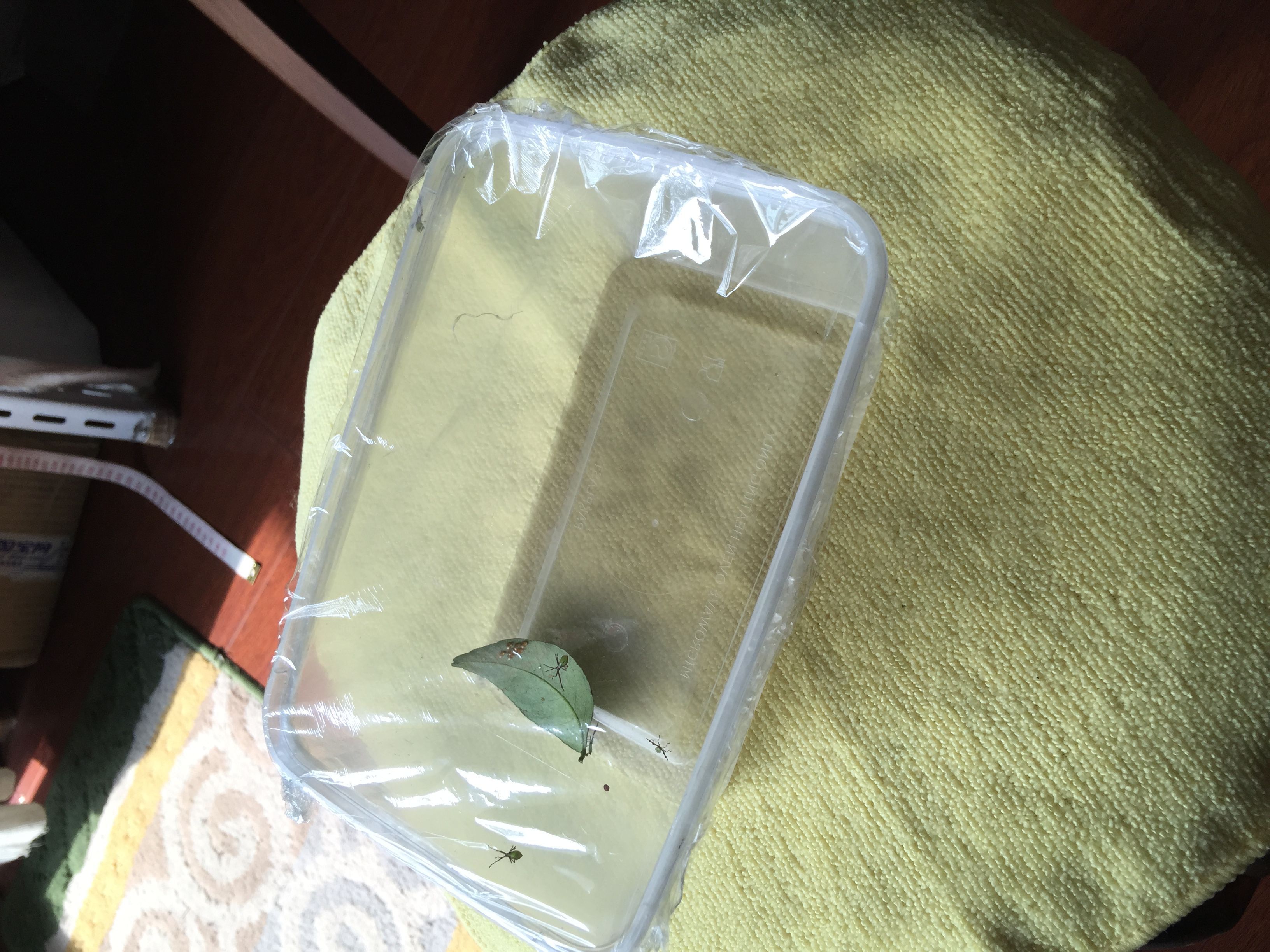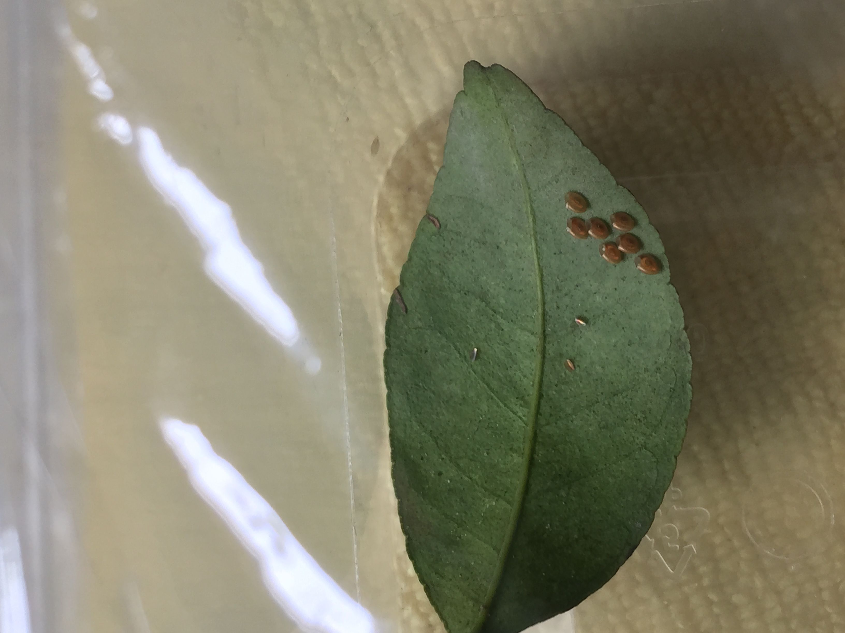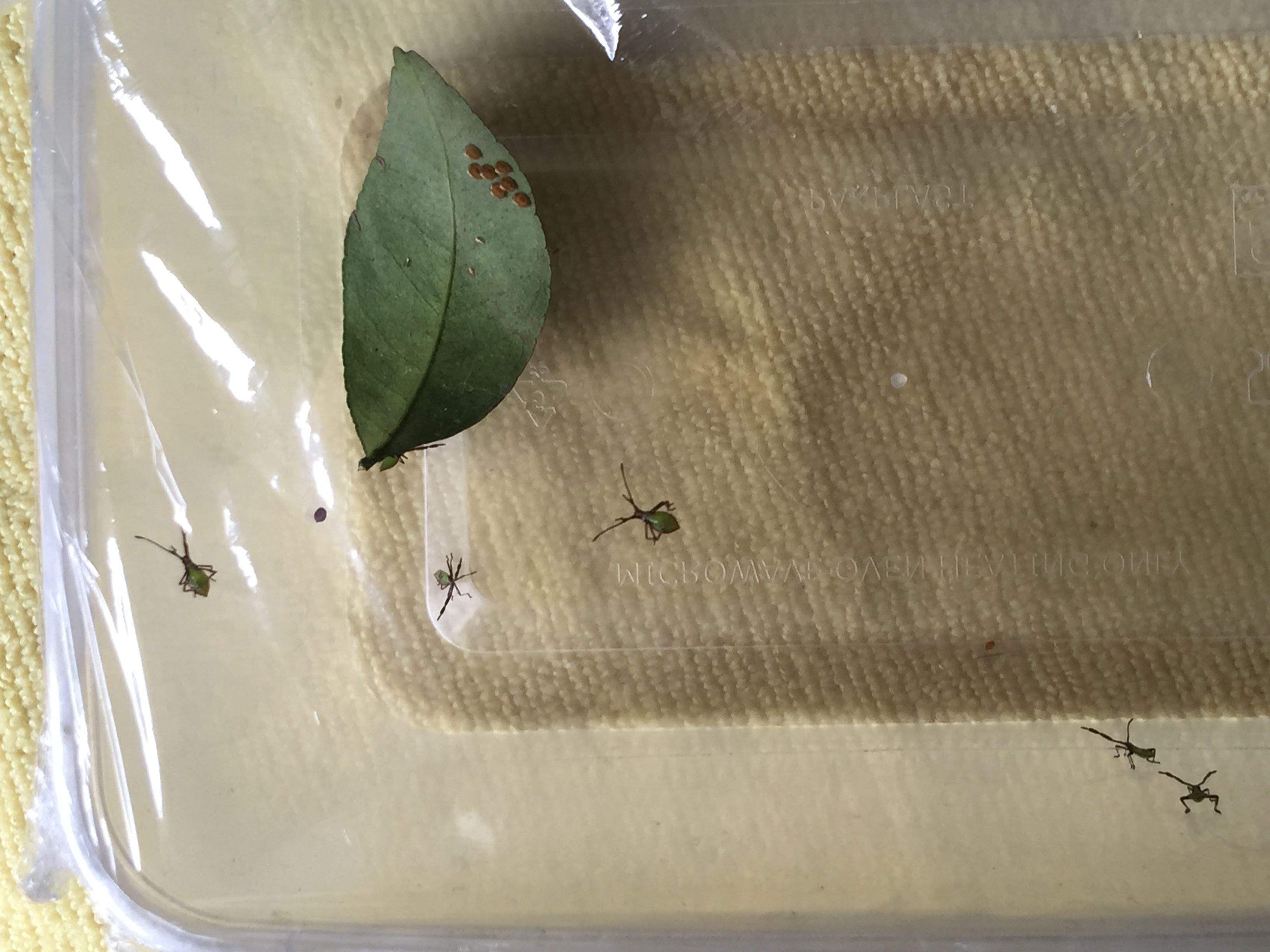 沙糖桔树一张叶子上排着虫卵,放盒子盖上保鲜膜做观察,好奇心啦 一晚上变出六个小虫子,请问是什么虫?
