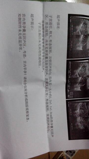 最後一次來月經是四月一號,這個月沒來,去買了驗孕紙測試了,兩條紅,上個星期天去醫院照了個B超,我看