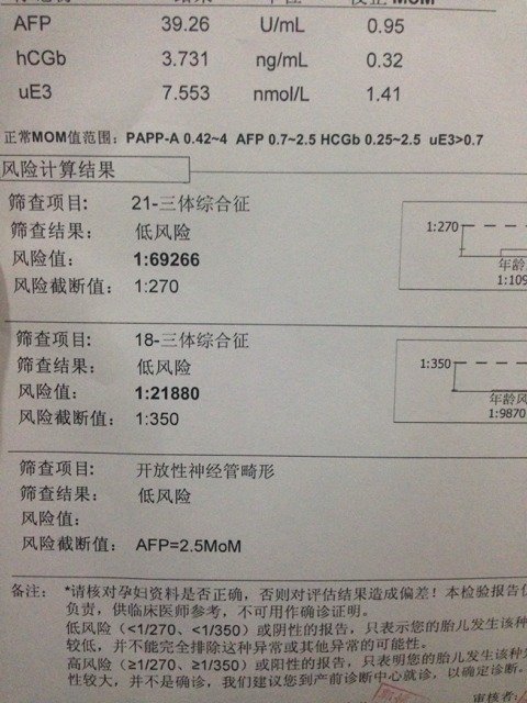 你好:你的唐氏筛查结果是低危,表明胎儿是唐氏宝宝的风险较低,但唐氏筛查结果与月经周期、体重、身高、孕周、胎龄大小等因素有关,任何因素的误差(如月经周期计算不准确、胎龄大小计算失误等)都可能造成结果的不准确。因此,这种情况是需要根据其它检查的结果综合考虑是否需要进一步检查。 明确诊断的话可以做羊水穿刺...