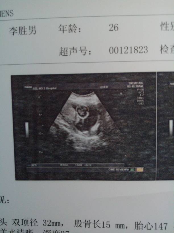 胎头双顶径32mm,股骨长15mm,胎心147次/分,胎盘位于子宫后壁,0级,羊水清晰,深度37m