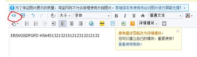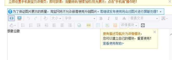 使用的是网页上传!之前自己好像是添加了一个描述模板,可是已经在淘宝买了一个新的模板并且使用中, 还是不能打字,以前的模板还不知道在哪里能删掉!打字要点击一下源码才能打字可是又不能编辑文字样式!如图!请大神指点 万分感谢