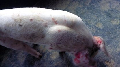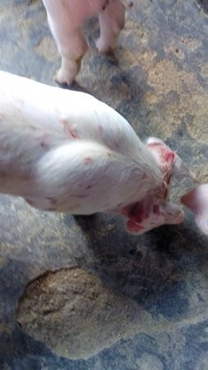 症状:猪瘟和流感相似。猪体温升高至40~42℃;病猪精神沉郁,食欲减少,严重的食欲废绝;头、耳和四肢下部有淤血斑;后肢软弱无力,走路摇晃,喜卧,咳嗽,严重时呈犬坐姿势;口流白沫,怀孕母猪可发生流产。