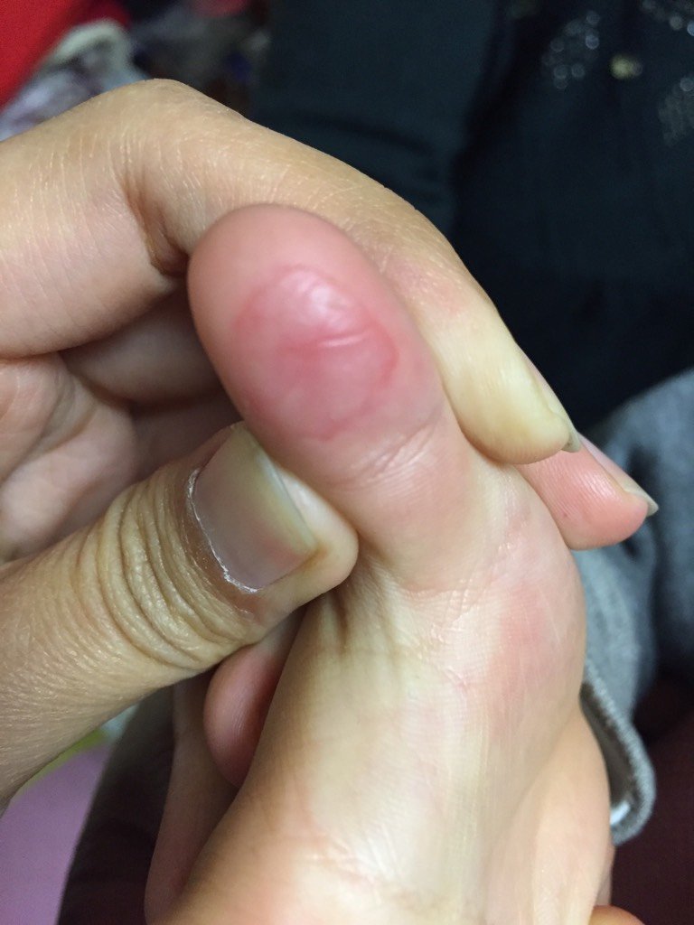 宝宝四岁多了,最近手指肚出现如照片的异样,一只手大拇指肚,一只手食指肚出现这种状况!宝宝说不疼也不