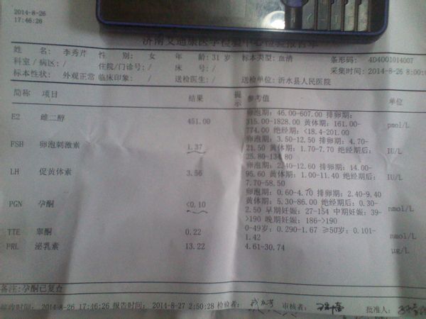 内分泌六项,孕酮和雌二醇 卵泡刺激素低于正常值,会是什么原因引起的呢?怎么调理 经以前一直不正常,拖二三月才来,有孩子后,拖一个月,有时按时来,想要二胎,结果上月看卵泡小有好多个,也没长起来,前二天查内分泌六项,孕酮和雌二醇 卵泡刺激素低于正常值,会是什么原因引起的呢?怎么调理,医生说开三月妈富隆,我怕有副作用,没拿,现在正减肥,感觉胖了也有关系,想配药一起调,不知道吃什么了,懂的帮忙给看看 点击展开 匿名用户 2014-09-02 15:36 推荐回答 卵泡刺顿浅激素太低荒昌了,孕酮也好低。你月经是不是不正常啊法辨间?看着你排卵功能很不好哟 匿名用户 2014-09-02 16:59 宝宝知道提示您:回答为网友贡献,仅供参考。 相关问题 做内分泌六项,雌二醇是 查内分泌六项,孕酮和雌二醇 卵泡刺激素低于正常值,会是什么原因引起的呢?怎么调理 卵泡刺激素5 21,促月经第四天化验激素六项:黄体素5 52,雌二醇226 6,泌乳素27 85,孕酮1 4