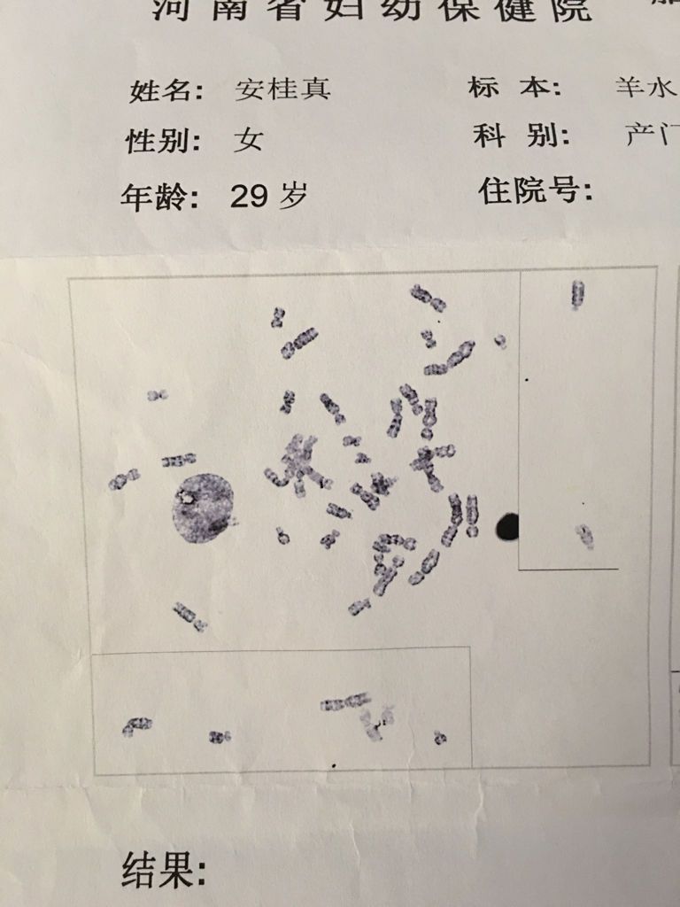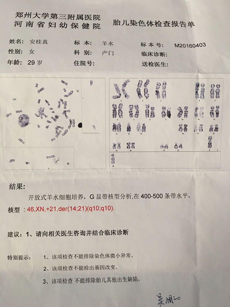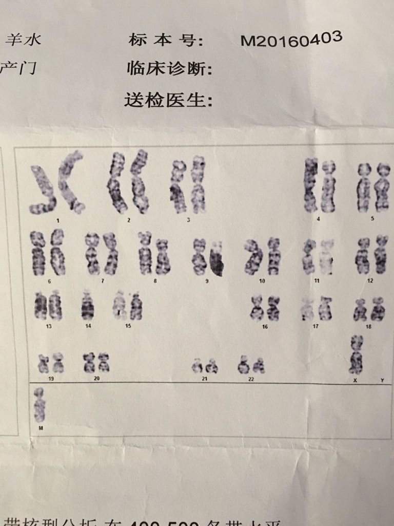 在400-500条带水平胎儿染色体核型为:46,xn,der(14;21)(q10;q10).什么 在400-500条带水平胎儿染色体核型为:46,xn,der(14;21)(q10;q10).什么意思,der(14;21)怎么回事?急。。 点击展开 匿名用户 2016-05-06 14:16 满意回答 也就是不能排除胎儿微小畸形,还有可能有出生缺陷。 cn#BkVapLuGGk 2016-05-06 19:32 宝宝知道提示您:回答为网友贡献,仅供参考。 相关问题 胎儿染色体核型分析结果:45,XN,der(14;22)(910;910)对胎儿有什么影响? 产前诊断时发现胎儿X\Y染色质皆阳性,第21染色体多一条 胎儿核型如何?患什么病? 半年前稽留流产,查胎儿是染色体21三体,现在又准备怀孕,请教一下那些检查项目有必要做: