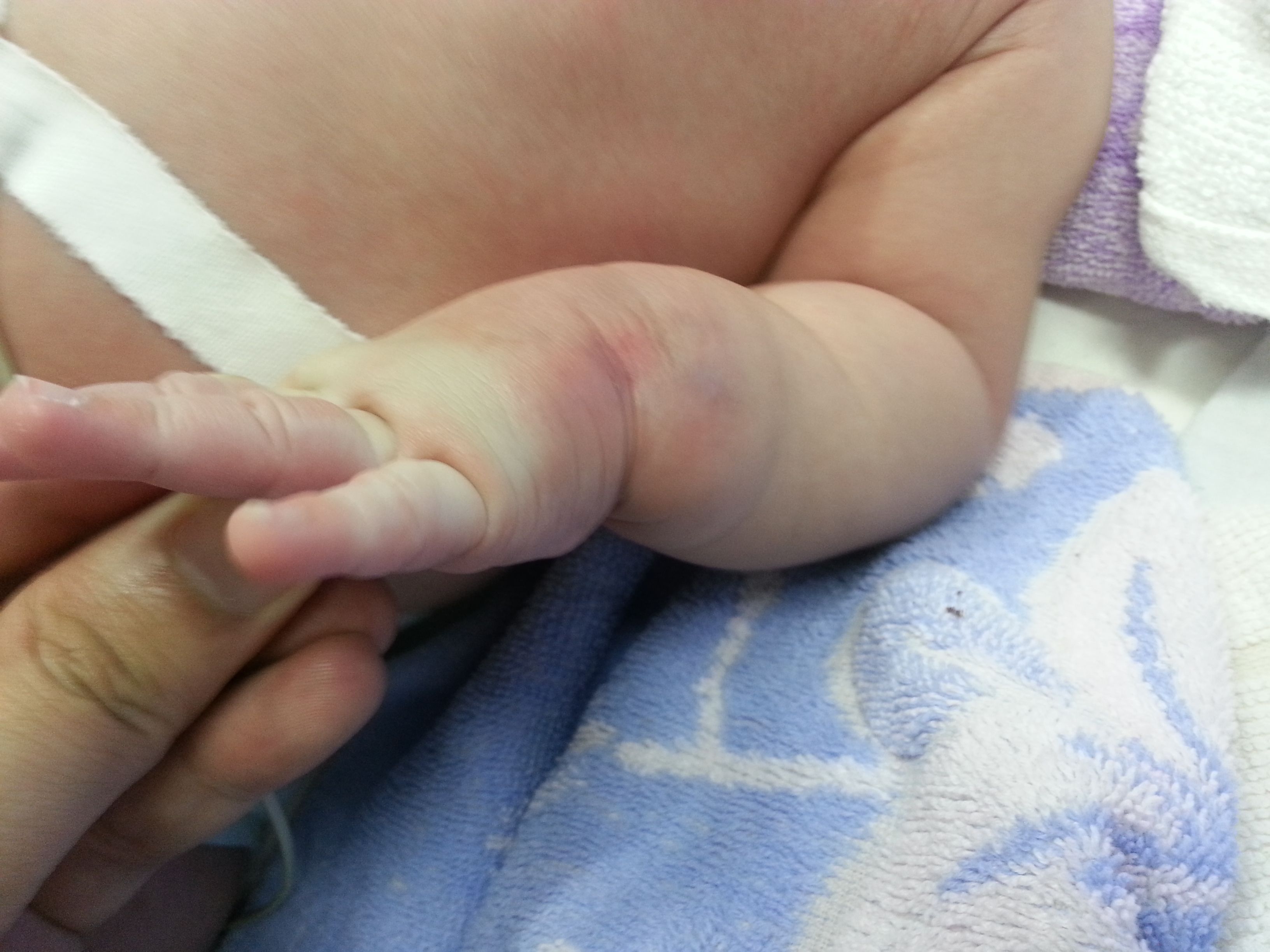 患者信息:男 0岁 贵州 遵义 病情描述(发病时间、主要症状等):出生在我科治疗20天,然后自发性的出现皮下包块,左上肢腕关节1.0*0.6大小,质地韧,无发红及皮温升高,上周右下肢踝关节同样(0.3*0.5),今天右上肢手掌背部(0.4*0.5)也出现。目前无发热等明显感症状,最初入院诊断是:新生儿肺炎,呼吸窘迫,HIE,现在不能完全脱离氧,上(最初3天)呼吸机3天,左上肢输入过葡萄糖酸钙,但是右下肢及左上肢,已经很长时间没有输注液体。目前用药只有头孢类,神经节,和一组氨基酸。想得到怎样的帮助:请问是原因包块,诊断考虑?曾经治疗情况及是否有过敏、遗传病史:出生是个巨大儿,家族无过敏史。
