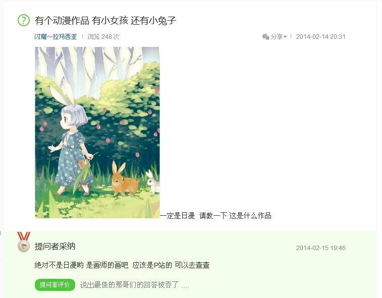您好,在百度上看见您有问过有小女孩 还有小兔子的图片是不是日漫,请问您清楚出处了吗?是否方便告知? 点击展开 匿名用户 2016-05-14 11:38 满意回答 这个还真不毯助了是日漫,是画师一张原创作品。出自P站葵涌画师「滝川悠尺哑」画师id=1091995作品id=10081773原图 匿名用户 2016-05-14 11:48 宝宝知道提示您:回答为网友贡献,仅供参考。 相关问题 这个卡通小女孩叫什么名字啊,在百度图片中怎么才可以搜到 头戴星星的卡通小女孩叫什么名字?我需要一样的图片 百度搜什么名字能搜出来?如图所示 求一进入百度知道的时候那张立秋图片 上面有个小女孩呢求立秋的图片 就是今年的