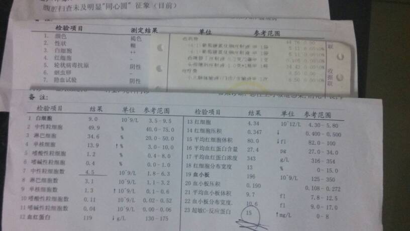 三周岁半孩子腹痛拉肚子!吃了东西痛拉肚子前痛!验了大便白细胞++其它都好!验血图如下!前天妈咪爱~