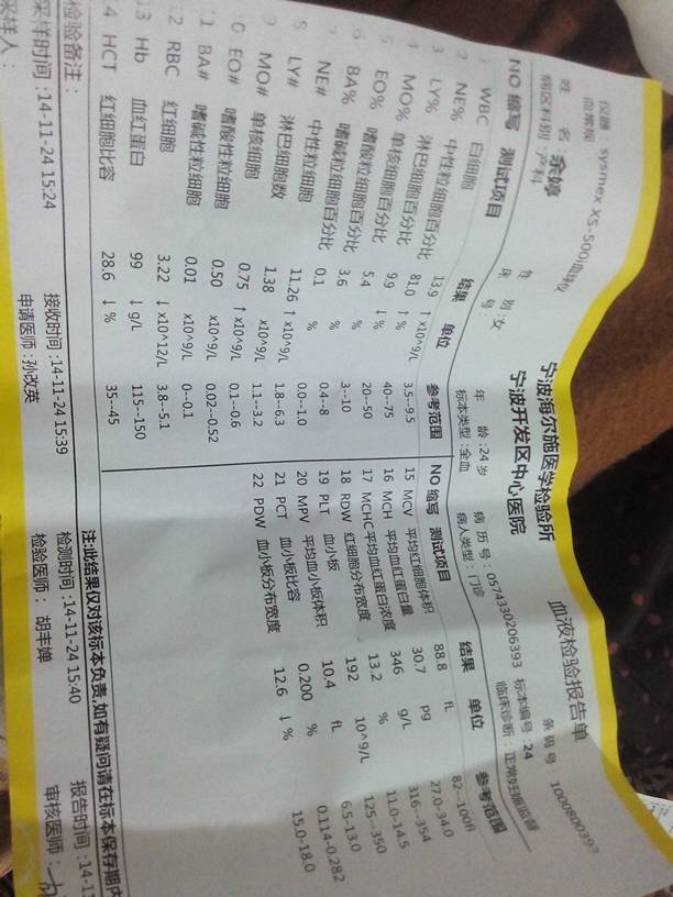 这是一张血常规检查结果单,上面显示白细胞,中性偏高,有可能是感染引起的.红细胞,血红蛋白偏低,,轻度贫血.您未给任何信息,仅从一般角度来看,第 一,找出原因,是什么原因引起的白细胞升高,什么原因引起的贫血?第 二,针对性治疗.