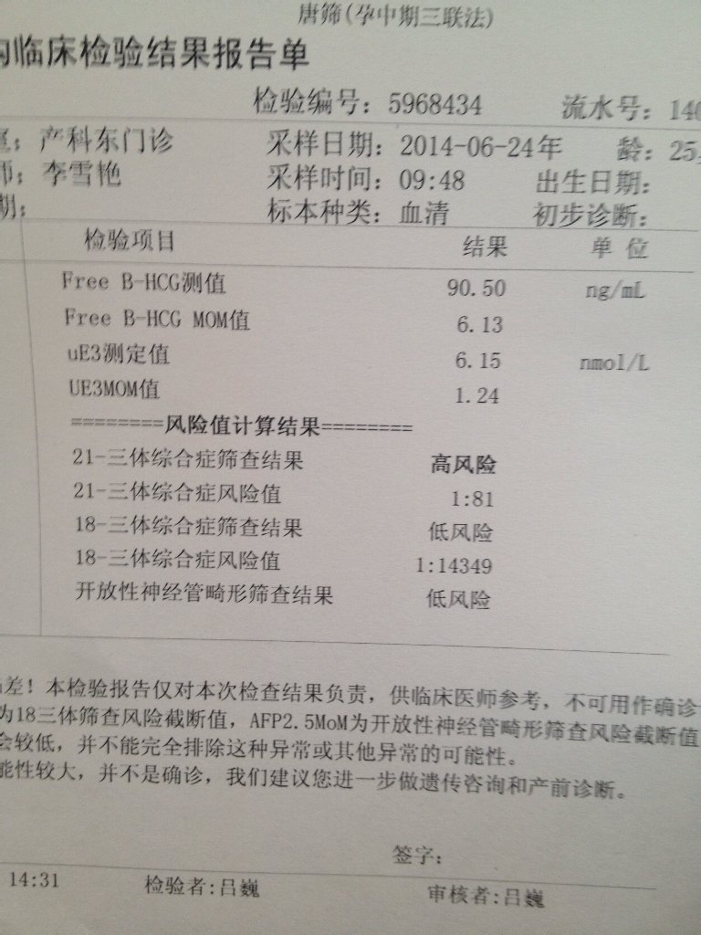 有一样高危医生叫我做羊水穿刺好担心阿是宝宝有问题吗这个宝宝是男宝 对我太重要咯 有一样高危医生叫我做羊水穿刺好担心阿是宝宝有问题吗这个宝宝是男宝 对我太重要咯 点击展开 大宝妈妈 2014-07-01 16:23 为您推荐: 其他回答 羊水穿刺比抽血准确,有一定风险性,但检查可提供参考,为临床诊断提供依据, WEIXIANERYUAN 2014-07-01 16:36 要吃到三个月才好 @满满@都是爱@ 2014-07-01 16:31 相关问题 我的唐氏筛查出来了,高危、说什么是21体综合症,问下宝妈们有和我一样的吗?有医生建议做羊水穿刺,问 有医生帮我看下AFP为10 07属于唐氏高危我需要做羊水穿刺吗? 我想问的是这个BB会不会有问题?因为唐氏筛查21三体系高危,1:85 一定要做羊水穿刺吗