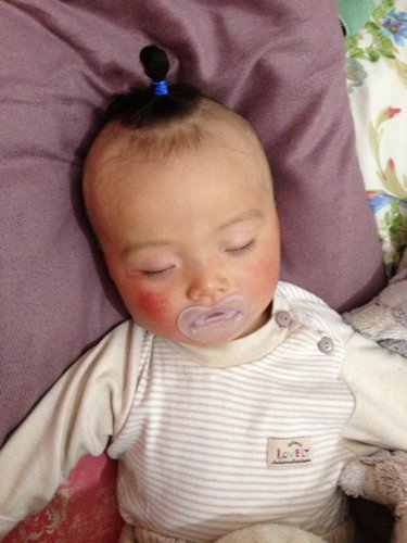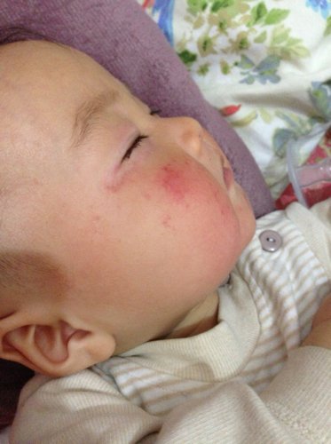 我宝宝今天哭了一天晚上就这样了眼睛里还有黄色的眼屎眼睛周围都是红色的小疙瘩像是湿疹