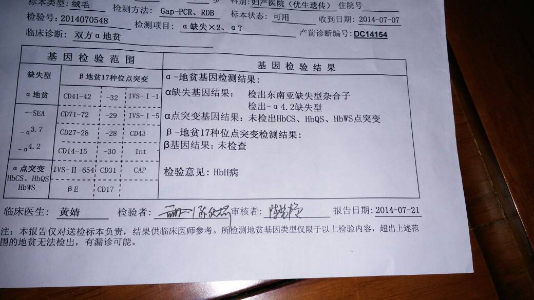 我夫妻双方a地贫,已怀孕,做了绒毛穿刺手术,今天刚拿到地贫基因产前诊断报告单,a-地贫基因检测结果