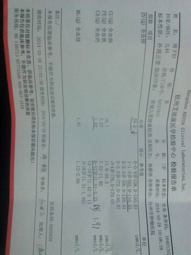 帮我看看这个单子 现在该给补什么 谢谢 帮我看看这个单子 现在该给补什么 谢谢 点击展开 宇轩baby 2014-10-22 17:22 为您推荐: 其他回答 你好,你家孩子的化验结果只有血锌的含量减低,其他的微量元素都正常,可以直接补充葡萄糖酸锌就可以了 小老板619 2014-10-23 14:52 医生明显的标出来了,缺锌(⊙o⊙)哦,可以喝点赖氨葡锌颗粒 aixiao_1111 2014-10-22 17:53 这个地去问医生啊,,, lvoe老公 2014-10-22 17:40 相关问题 麻烦你们帮我看看我这个B超单子上得宝宝好得不谢谢了 帮我看看这个单子有什么问题吗孩子多少斤,谢谢 怀孕29周了,这是今天做彩超的单子帮我看看有什么问题,医生说没什么 但是我还是很担心