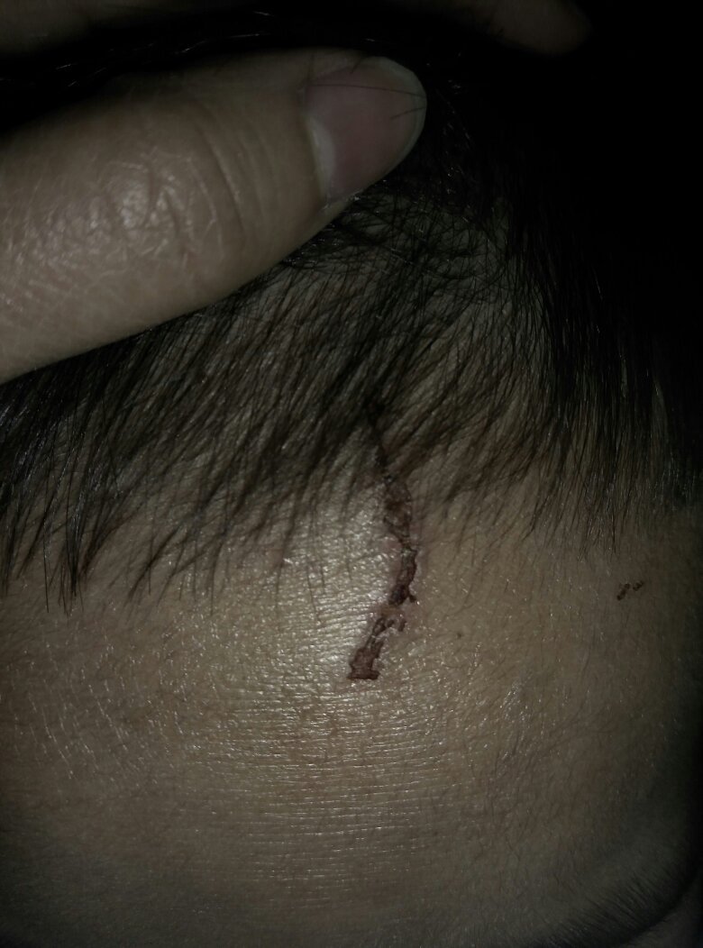 在药店有紫药水卖,擦上很快结疤落疤的,小孩疤后会随着年龄增长而淡化的