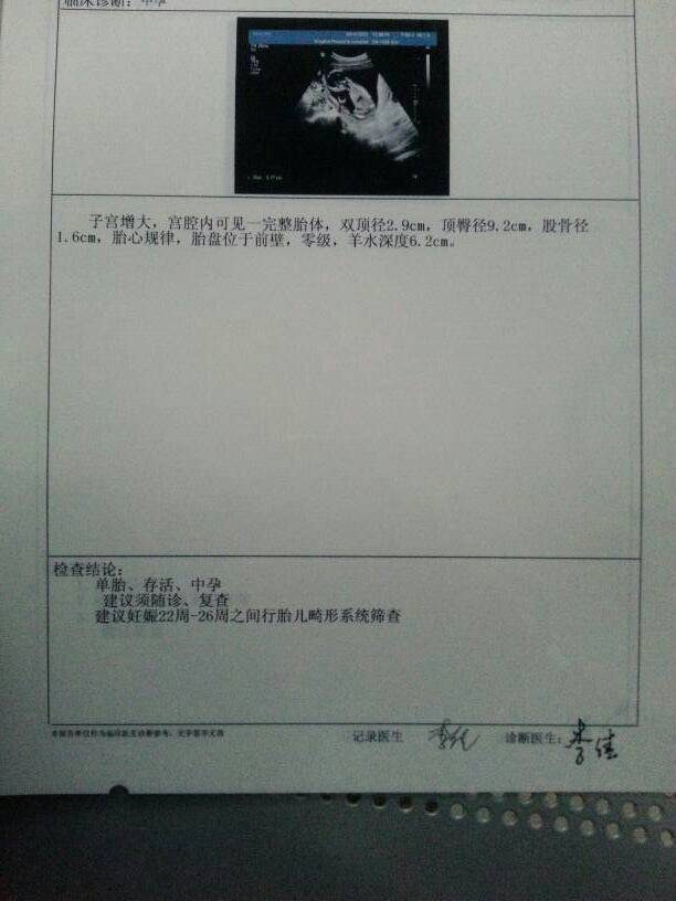 你好:从彩超检查结果来看胎儿发育是正常的。 建议在孕22至26周时行四维彩超排畸检查,因为在这段时间内胎儿的肢体及各主要脏器已经全部发育,而且羊水量较适中,胎儿骨骼回声影响比较小,图像清晰,因此这个时期适合做胎儿畸形筛查。