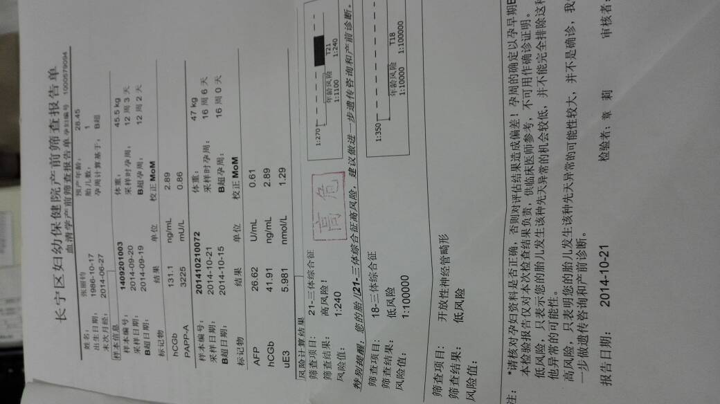 从提供的唐氏筛查报告看,21-三体综合征1:240属于高危。建议做羊水穿刺或无创DNA检查,进一步排除。