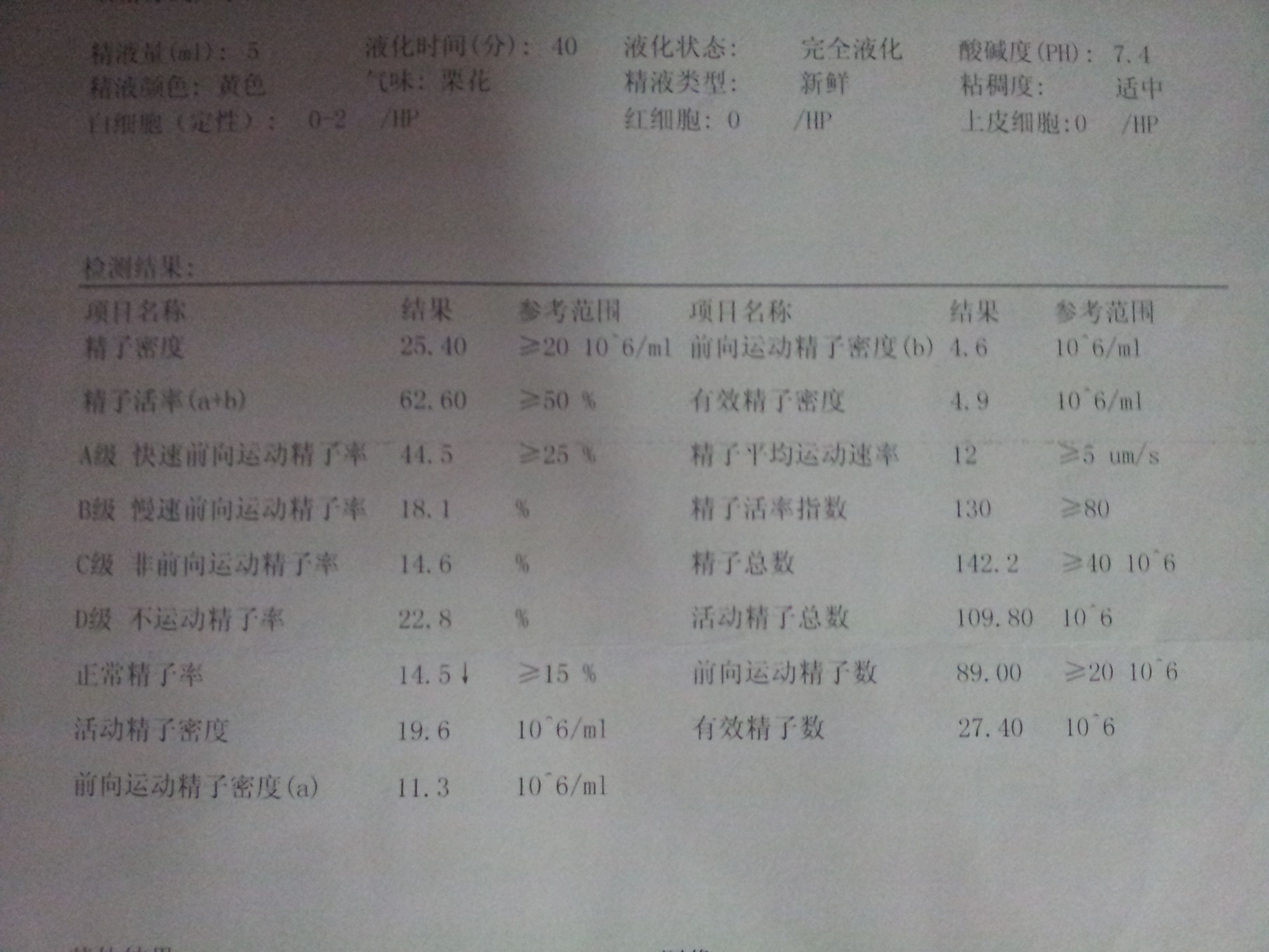有有没有专家在线帮我分析一下这精子报告正常吗?可以使女方受孕吗,医生说正常?可怎么不见女方肚子大感谢 点击展开 匿名用户 2013-05-05 17:55 满意回答 恭喜你,你的精液报告显示你是正常的。 黎心宜_6lOR 2013-05-05 19:08 宝宝知道提示您:回答为网友贡献,仅供参考。 为您推荐: 其他回答 这就是女方的问题 匿名用户 2013-05-05 18:01 相关问题 我老公的精子检验报告请专家帮我看看 非常感谢 正常精子形态2 94%能自然受孕吗? 精子活力低怎么受孕,如图