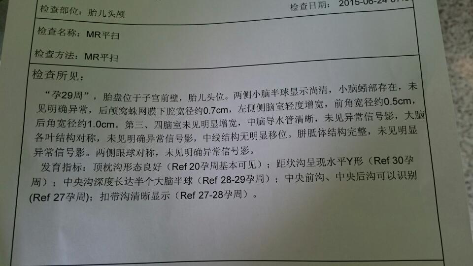 从你的胎儿核磁检查看应该没问题。建议你们,两周后继续观察大山里的侧脑室,一侧较寬需注意脑积水情况。