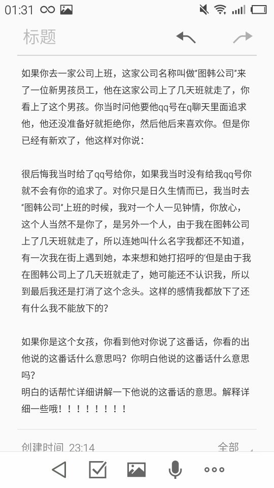 如果你去一家公司上班,这家公司名称叫做“图韩公司”来了一位新男孩员工,他在这家公司上了几天班就走了,你看上了这个男孩。你当时问他要他qq号在q聊天里面追求他,他还没准备好就拒绝你,然后他后来喜欢你。但是你已经有新欢了,他这样对你说: 很后悔我当时给了qq号给你,如果我当时没有给我qq号你就不会有你的追求了。对你只是日久生情而已,我当时去“图韩公司”上班的时候,我对一个人一见钟情,你放心,这个人当然不是你了,是另外一个人,由于我在图韩公司上了几天班就走了,所以连她叫什么名字我都还不知道,有一次我在街上遇到她,本来想和她打招呼的‘但是由于我在图韩公司上了几天班就走了,她可能还不认识我,所以到最后我还是打消了这个念头。这样的感情我都放下了还有什么我不能放下的? 如果你是这个女孩,你看到他对你说了这番话,你看的出他说的这番话什么意思吗?你明白他说的这番话什么意思吗?明白的话帮忙详细讲解一下他说的这番话的意思。解释详细一些哦!!!!!!!!
