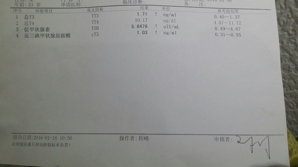 怀孕建卡检查甲四项TT3高,TSH高,rT3也高怎么回事啊?医生说我这个检查单子有问题?好担心肚子 怀孕建卡检查甲四项TT3高,TSH高,rT3也高怎么回事啊?医生说我这个检查单子有问题?好担心肚子里的胎儿,我是双胎为什么会出现这种情况啊?好担心。 点击展开 1_ScuE 2016-01-19 21:33 为您推荐: 其他回答 除了T4,都超标了 匿名用户 2016-01-19 23:53 相关问题 怀孕14周了,建卡检血,医生说甲状腺tsh值3 3有点偏高,要我吃药,我怀孕前检查正常,这个要吃药 怀孕两月,我肝功能正常,老公有小三阳 验血结果HBCAb阳性,其它都是阴性?想请问医生,对肚子里的 怀孕五个半月,今天去检查了四维彩超 和胎儿心电图,肚子里面的宝宝才一斤三两 医生说正常的?请问宝妈
