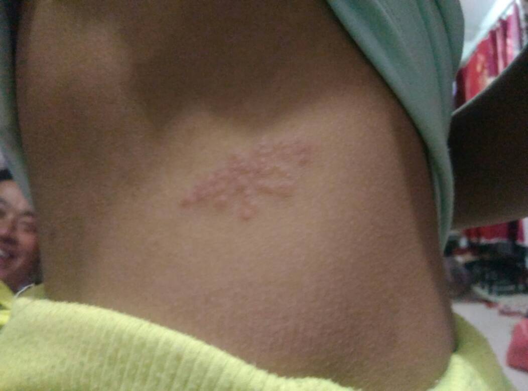 这个是带状疱疹.这个是带状疱疹病毒所致,为限局灿凡性簇集逼糟性红斑,丘疹,较严重出现小水疱,易破溃。可以服用阿昔洛韦片 维生素B1,按说明书用即可。破溃处外用碘伏,无破溃处用炉甘石洗剂,水疱不要弄烂,不要碰水录布毯