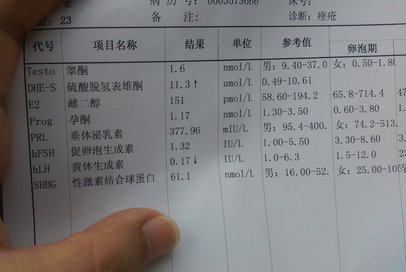 月经第四天查激素,黄体生成素0.17硫酸脱氢表雄酮11.3 有痤疮,血压比较低,之前有减肥 月经第四天查激素,黄体生成素0.17硫酸脱氢表雄酮11.3促卵泡生成素1.32请问我这样的状况严重么?我长痤疮,血压比较低,之前有减肥。 点击展开 匿名用户 2014-08-13 09:39 为您推荐: 其他回答 不要用减肥的产品了,自己的身体都不好好爱惜,我做代理这么久了,从来不乱卖减肥产品 匿名用户 2014-08-13 09:54 相关问题 多囊,雄激素不高,没有多毛痤疮,月经不来,需吃黄体酮一周来 月经量少,不足两天,颜色淡,还伴有便秘,脸上长痤疮,做个激素六项检查,希望帮我看下是不是激素问题 男人可以吃避孕药抑制痤疮吗,效果如何,有什么样的雌性激素可以食用?