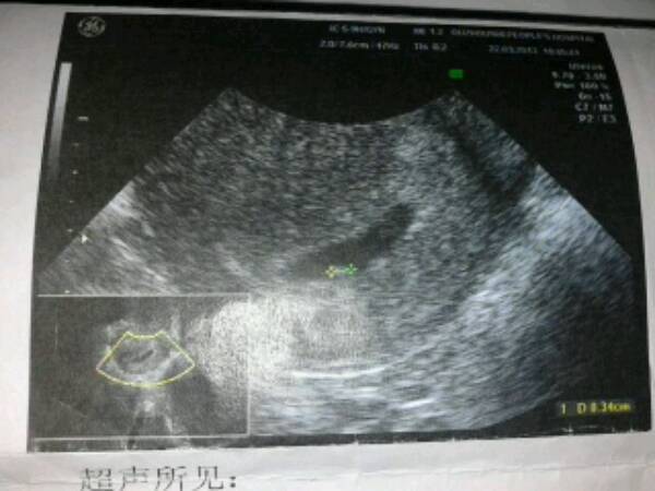 子宫前位,形态饱满实质回声尚均匀,宫内可见一大小约2.8×1.1cm的孕囊回声,囊内可见卵黄囊、胚芽