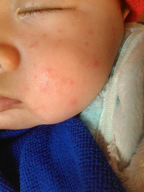 宝宝三个月了,昨天她就开始脸上手脚都长了红点 会不会是我前天吃了田螺的关系?她在喝母乳 怎么办,急