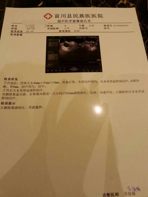 月经推迟6天没来,来咖啡色的东西一个星期,去医院检查没怀孕,医生建议做阴道B超,结果显示为这样,有 月经推迟6天没来,来咖啡色的东西一个星期,去医院检查没怀孕,医生建议做阴道B超,结果显示为这样,有没问题啊? 点击展开 匿名用户 2014-06-10 19:57 为您推荐: 其他回答 患者为右侧卵巢囊肿疾病,该疾病属于良性的病变,需要考虑生理性囊肿及病理性囊肿,生理性囊肿一般在三个月后会缩小的。 shenglongxiao 2014-06-12 19:42 相关问题 ,怀孕两个半月时间,可打b超才7周,2月16末次月经,5月2号打b超,怀孕一个月来了咖啡色很少没有 我最近胸很疼,也变大了,阴道会有疼痛感,但偶尔会疼,一下就好了,月经也有推迟13天,我是怀孕了还是 我怀孕6周多了,但是阴道和内裤都有点湿润,老是感觉像是月经来临的那种感觉,但是一看又没有 这正常么
