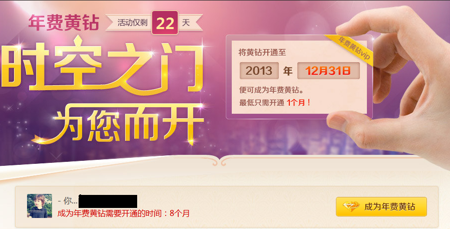 开通年费黄钻 这两个活动有没有矛盾 如果支付八个月的 成为年费? 然后有没有回复原先的成长值? 点击展开 匿名用户 2013-05-26 20:44 满意回答 对,你再开8个月,你就会升级成年费耻印呈黄愿刺钻,你原有经验值之崇也就回来了 匿名用户 2013-05-26 20:47 宝宝知道提示您:回答为网友贡献,仅供参考。 为您推荐: 其他回答 是的,只需要开通8个月,你就能享受到年费黄钻的待遇,而不需要开通12个月才可以 可以同时开通的 匿名用户 2013-05-27 12:25 相关问题 开通黄钻年费和八个月超级黄钻哪个更好 我的黄钻还有八个月 我现在冲多四个月 可以变年费黄钻么 我的Q开通了绿钻红钻黄钻请问在那里领QQ华夏里的宝宝如题 谢谢了