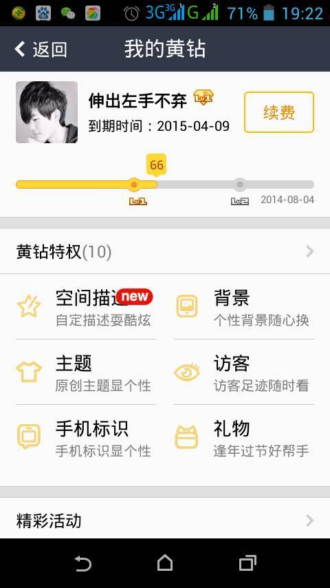 为什么QQ空间的黄钻自己开通了,而且还是九个月的,求解 点击展开 匿名用户 2014-07-11 20:00 推荐回答 哈哈哈哈哈。。。。。你的话费有没有被扣 匿名用户 2014-07-11 20:03 宝宝知道提示您:回答为网友贡献,仅供参考。 为您推荐: 其他回答 还是查下话费 匿名用户 2014-07-11 20:39 别人充错了 匿名用户 2014-07-11 20:06 肯定有人充错了,运气这么好买彩票去吧 匿名用户 2014-07-11 20:06 这么好的事我咋没遇到 匿名用户 2014-07-11 20:04 加载更多 相关问题 不开通QQ空间的女孩子会是一个什么样的人呢? 怎么样才能不努力免费赚多点Q币或者免费开通QQ会员和黄钻,最好没有大人的游戏的,我是小孩子 QQ空间上锁了,为什么他们会上锁呢?真好奇他们空间的内容,求解他们是怎么想的呢?如男生的