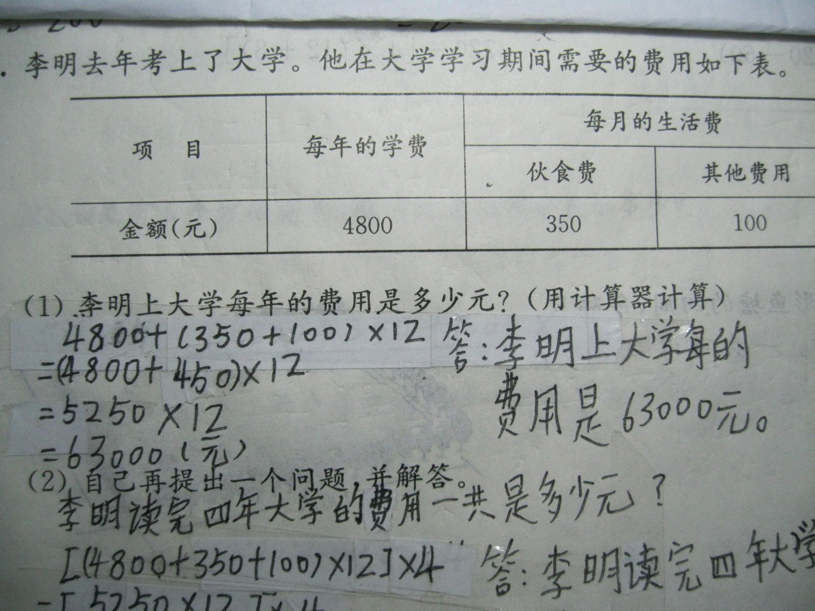 四年级数学题怎么计算求解要说明四年级混合运算计算方法 小孩算的不知对与错? 点击展开 匿名用户 2014-03-24 19:33 满意回答 第一题夕且祸不对学费是一年扬行的不用絮荒乘以12个月,伙食和其他是月的用乘以12.第二题也错了 匿名用户 2014-03-24 19:53 宝宝知道提示您:回答为网友贡献,仅供参考。 相关问题 一道小学三年级的数学题,不要列方程,用三年级小孩可以接受的方法讲 我想要小孩,如何计算日期 如何计算精确的生小孩的时间