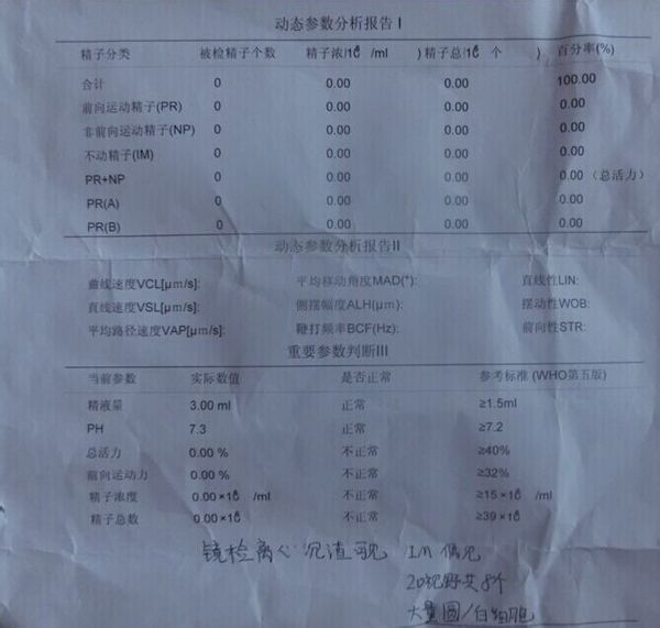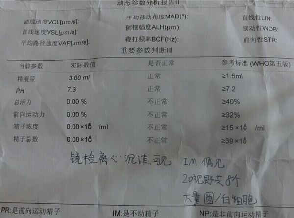 大家好 结婚两年了 我老婆一只没怀孕 今天我去检查了精液 这个精液检查结果说明精液有问题吗 点击展开 母婴用户902974984 2014-06-05 17:50 为您推荐: 其他回答 这个情况看来是睾丸坏掉了,做人工受孕吧! 匿名用户 2014-06-05 18:14 很大的问题 采样没有问题? 很有可能输精管阻塞 匿名用户 2014-06-05 18:06 小蝌蚪去哪儿了?你得问问医生,是什么原因。 匿名用户 2014-06-05 17:58 相关问题 结婚一年没怀孕,精液检查结果各位大夫帮忙看看 结婚四个多月还没怀孕是不是男方精子有问题…还是什么因素呢 和我老婆结婚半年多了,也没有怀孕 我去做了精子成活率检查,成活率达到百分之六十八,医生说没有问题…