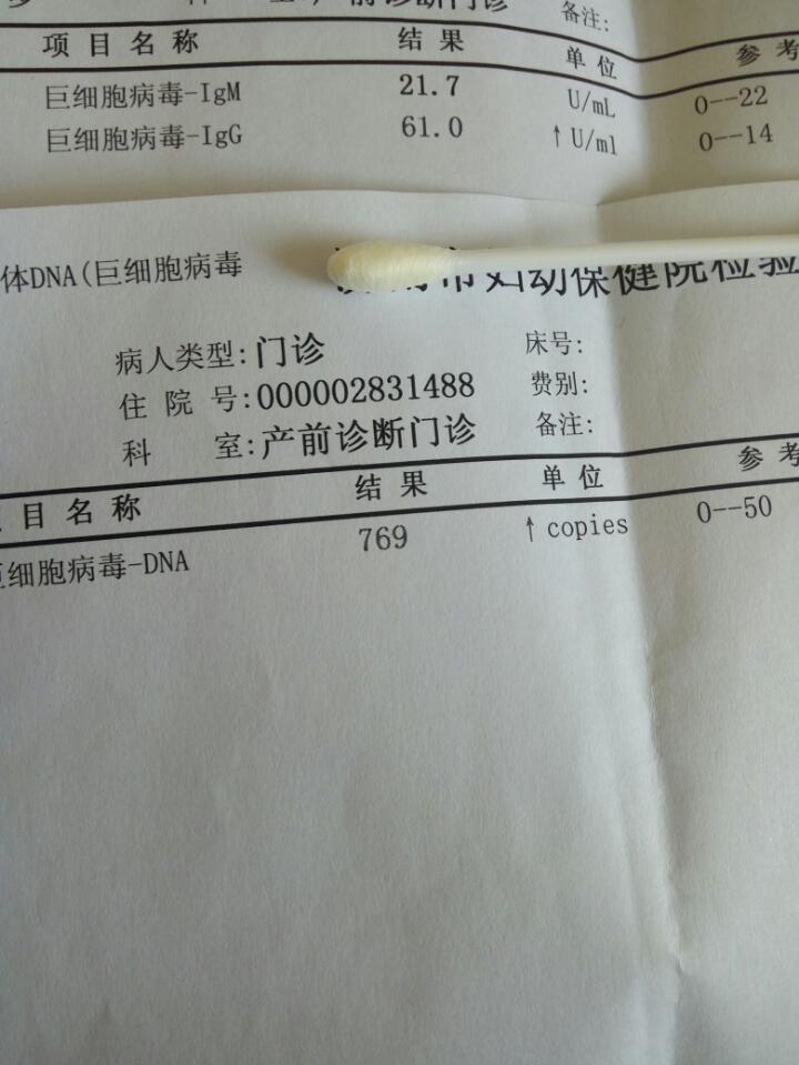 巨细胞病毒dna测定769(标准0-50)巨细胞病毒感染IgM 21.7弱阳性巨细胞病毒感