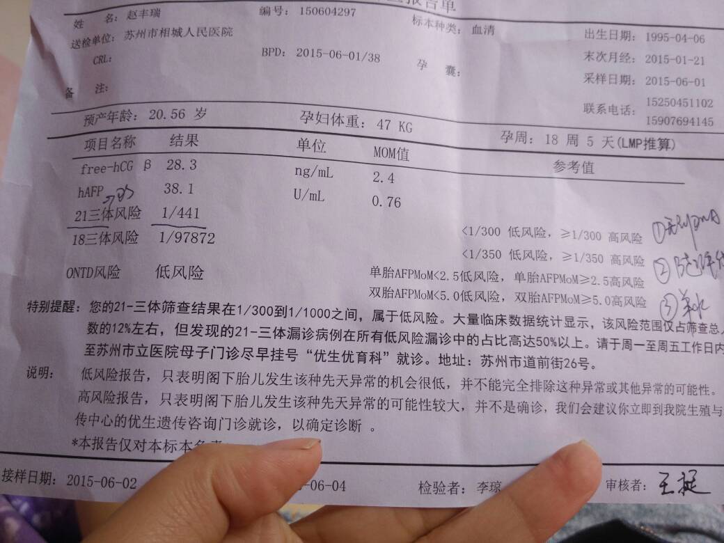 我今年21岁,从备孕到怀孕都没有吃过药物之类,家里也没有遗传病史,6月1号做的唐氏筛查,今天去拿的