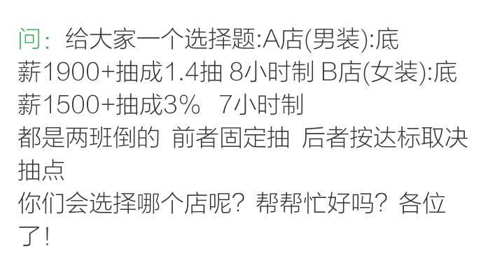 A店比较固定抽,8小时,男装,有礼貌招呼,人流量相对B店区域有所不同。B店不稳定抽,7小时,女装,人流区域位置多的。但我看来服装店的优势不是取决于人流多少,看整体,若要这样取决,那万达的话怎么办?是不?