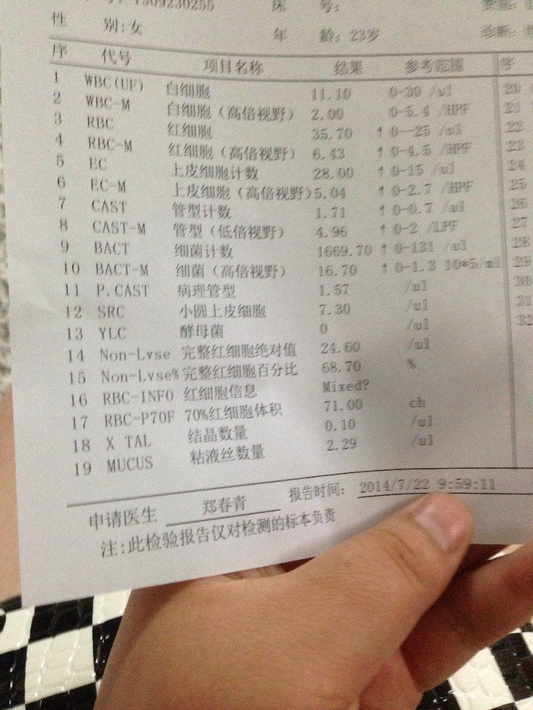 怀孕刚检查尿,这么多不正常的,严重嘛 怀孕刚检查尿,这么多不正常的,严重嘛 点击展开 原谅我孤独成性不会爱人! 2014-07-22 10:26 为您推荐: 其他回答 检查结果看有泌尿系出血、炎症现象,建议检查看看有无肾炎,目前积极对症治疗。 爱狂风一样舞蹈 2014-07-22 11:15 相关问题 怀孕八周 检查出了尿蛋白3+其他正常 怎么办呀 怀孕十七周,每天喝很多水,但是尿不多正常吗? 怀孕尿检查一直是弱阳性怎么办?急急急