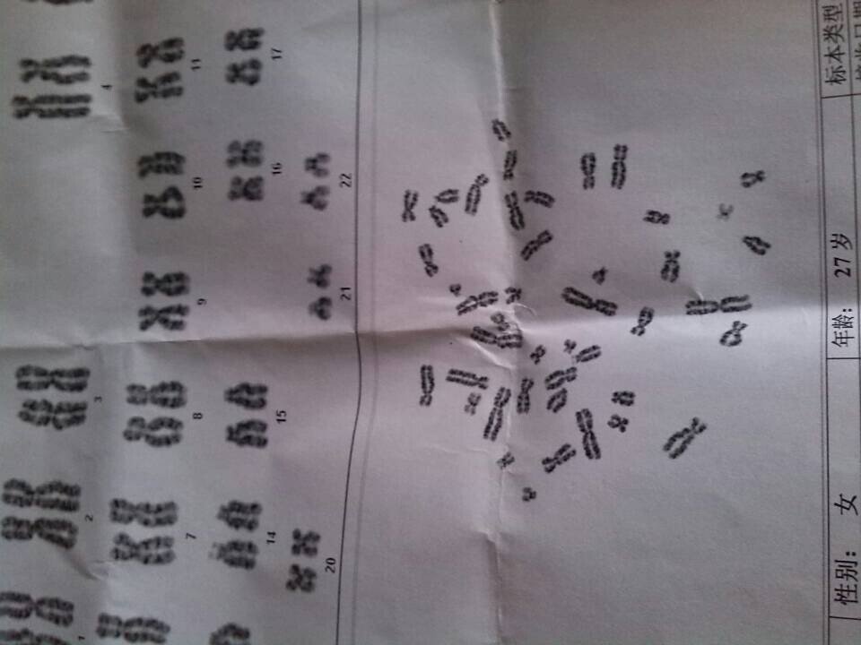 请问这个染色体图有何异常?这个是做羊水穿刺之后提取DNA 图片 请问婴儿是否健康? 点击展开 匿名用户 2014-09-02 17:09 为您推荐: 其他回答 你好,现在这个时候自己还是要注意检查一下打这个情况的话自己还是要注意,让作业本的医生给你看一下, 可靠的悠闲80 2014-09-03 20:47 相关问题 做无创dna结果少一条性染色体,需要做羊水穿刺确认吗?电话里医生还说如果是我的缺少的话会没问题,为 羊水穿刺结果是羊水细胞染色体G显带320条,46,14ps 上个宝宝是羊水多,做脐带穿刺说染色体有问题 八个月引掉了,我想半年后在要宝宝,还会向上一个宝宝一样