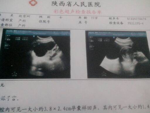 宫腔内可见孕大小约3.8x2.4cm孕囊样回声,其内可见大小约1.4x0.7cm胚胎组织及胎心博动