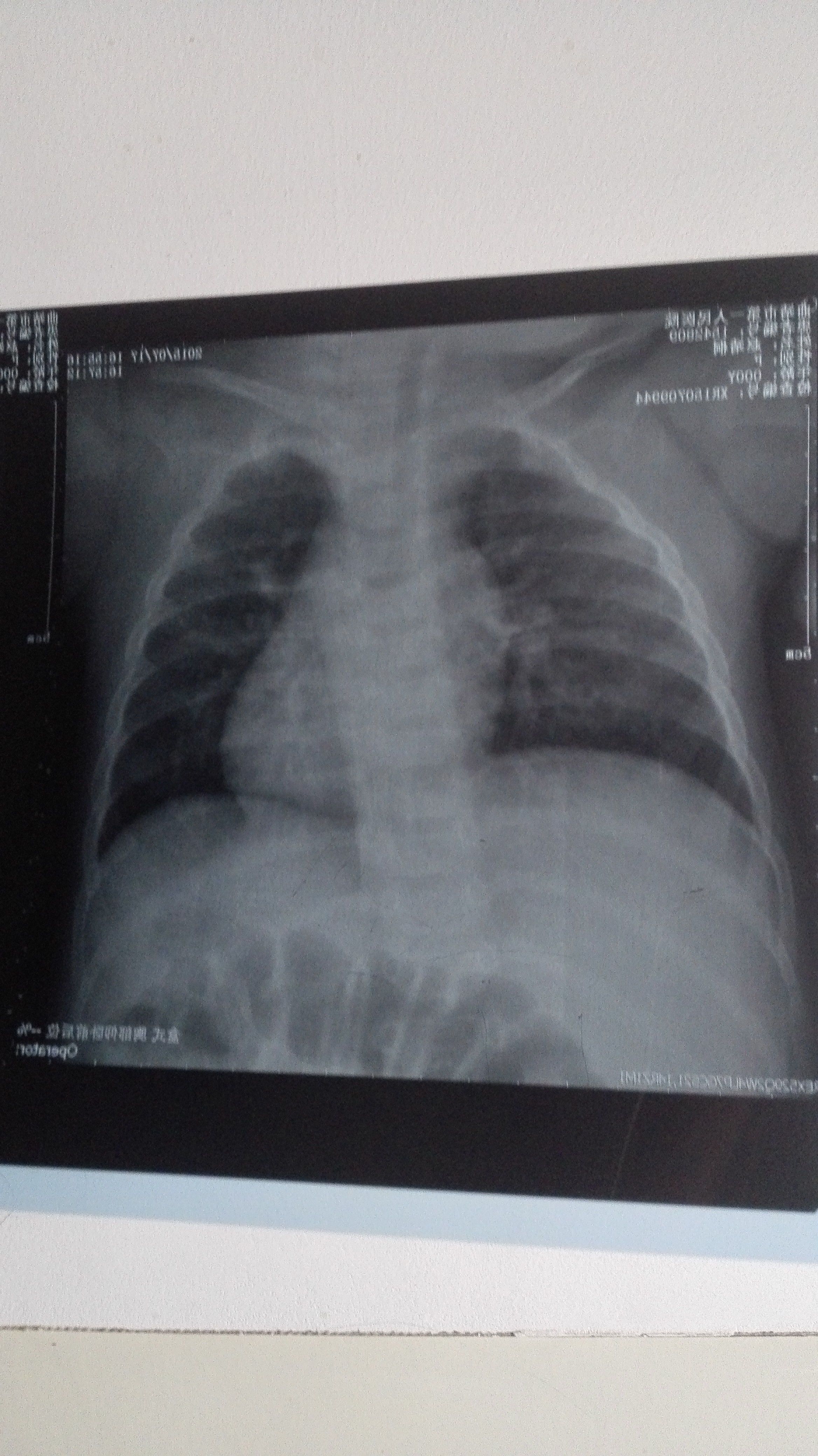 半岁婴儿胸片图,是不是肺炎 前几天发热,医生说看不出来,还要照CT,可怜的娃娃 点击展开 匿名用户 2015-07-18 20:44 满意回答 你好!从图片看,多是考虑有支气管炎的可能稼团洞!至于到肺炎的那种程度!还没有浅迷呢!可柴葵以根据血常规,来采用治疗方法 ˲88996 2015-07-18 20:57 宝宝知道提示您:回答为网友贡献,仅供参考。 相关问题 小孩一岁半了肺炎发热咳嗽做个CT说是两肺上都有炎正现住院输液一个多月了不见好急死人了,另外输液期间… 1月2号末次月经1月9号女儿肺炎拍了胸片我进去把着她因为还小怀孕了宝宝有事吗 胸闷胸病,照胸片 胸部CT 心电图查不出病因