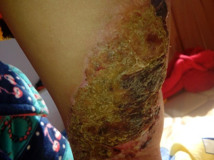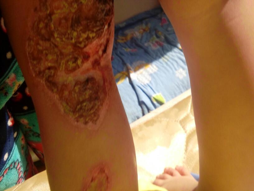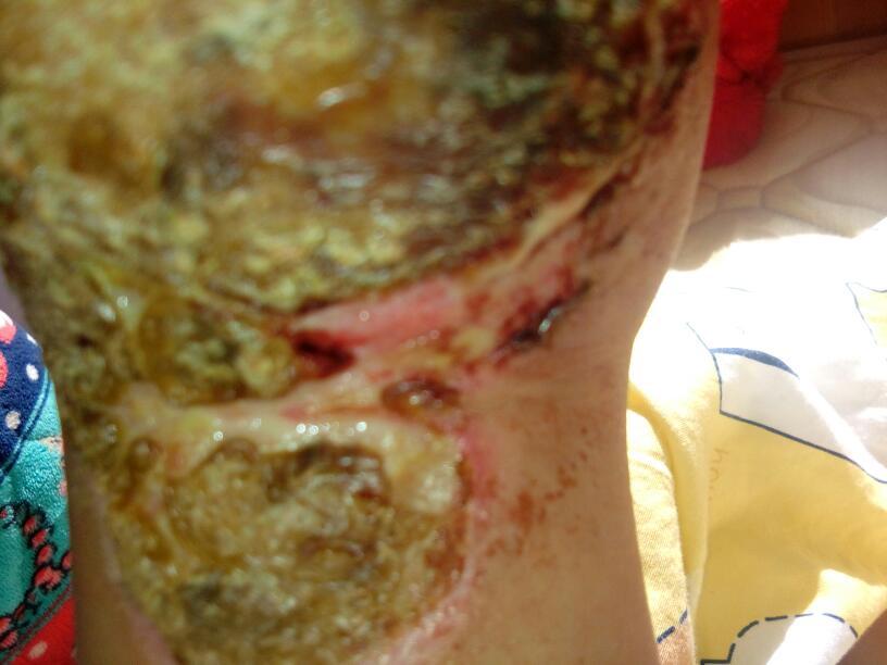 宝宝开水烫伤十天了,伤口已经结痂,但是最严重的这一块地方却老是有像脓一样的东西(请看图片),这是脓