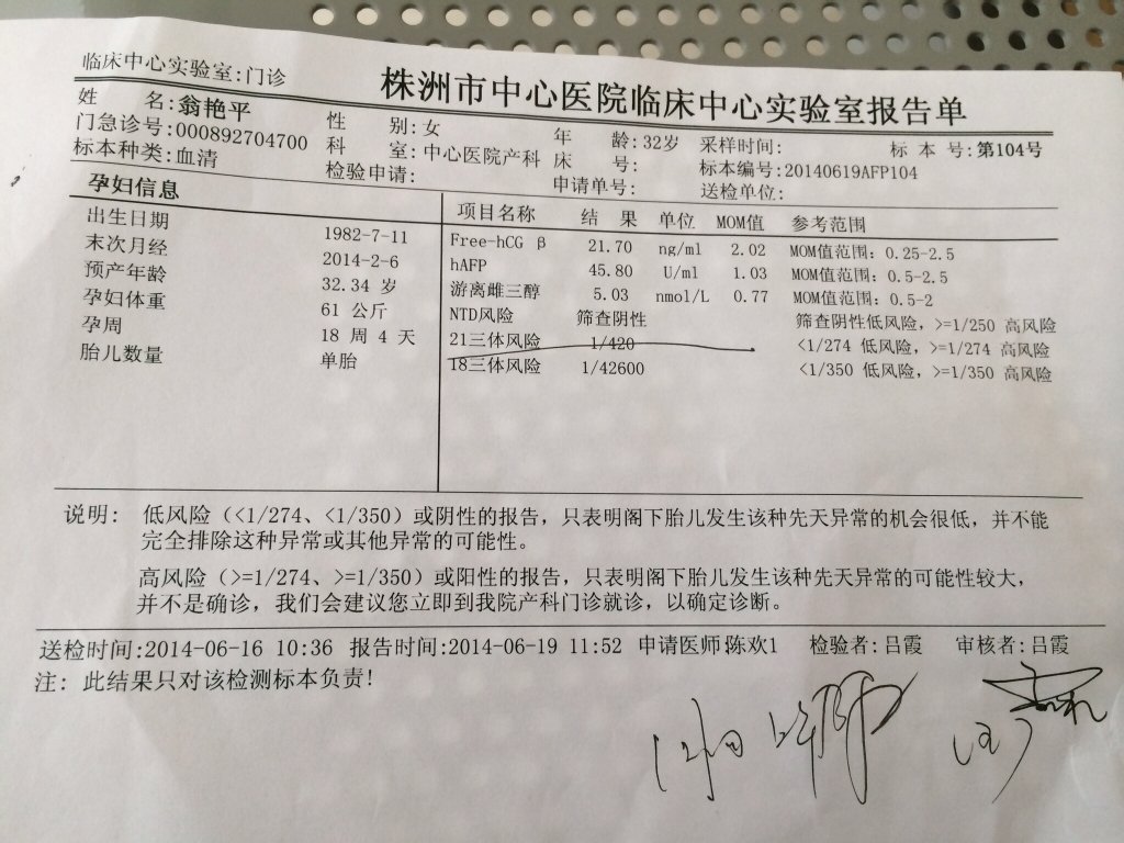 帮我看一下检查报告,其中一项有问题急 帮我看一下检查报告,其中一项有问题急 点击展开 天涯_zo0o 2014-06-23 17:36 为您推荐: 其他回答 唐氏筛查主要是筛查患有21三体综合征的概率,概率大只能说患有这个疾病风险比较大,是要进一步的采取羊水穿刺等检查措施的。 群岛舟山 2014-06-23 17:43 相关问题 请帮我看一下宝宝检查的肝功检查报告… 帮忙看一下我孕19+1天周的彩超检查报告,有没有问题呀,谢谢了 怀孕25周,B 超的检查报告,谁能帮我看一下?