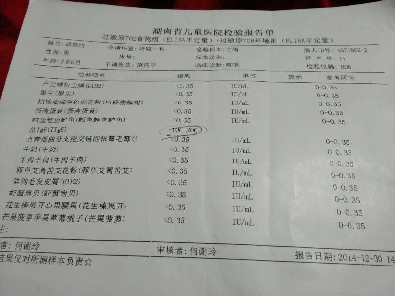您好,根据您的问题描述,为您回答如下: 你上传的图片我已经看到了,这是一份检验过敏原的结果。看了患者是2岁6各月的儿童,估计是因为荨麻疹或其他过敏性疾病为了寻找致敏原做的一个检查。这份检查结果提示:尚未发现致敏原,该患者对这些检查项目不过敏。总IgE的升高,说明该患者处于致敏状态。 希望对您有帮助,...