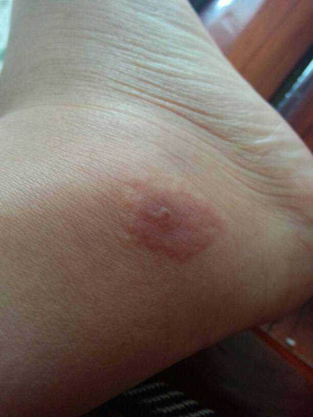 脚踝不知被什么虫子咬了,刚开始整个脚踝浮肿了两天,之后消肿了就有一个这样的肿包(看图),现在一个礼