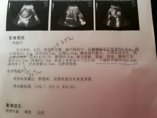 从您提供的胎儿彩超检查情况,目前胎儿双顶径87毫米,骨骼长63毫米,提示孕周约35周左右,目前胎儿股骨发育稍滞后,应该适当补充钙质,并定期随访观察胎儿发育进展情况。胎儿左侧侧脑室和后颅卧稍增宽,但是距离都在10毫米以下,没有超过15毫米,这种情况应该属于正常生理表现,可能是胎儿神经系统发育过程中的一...