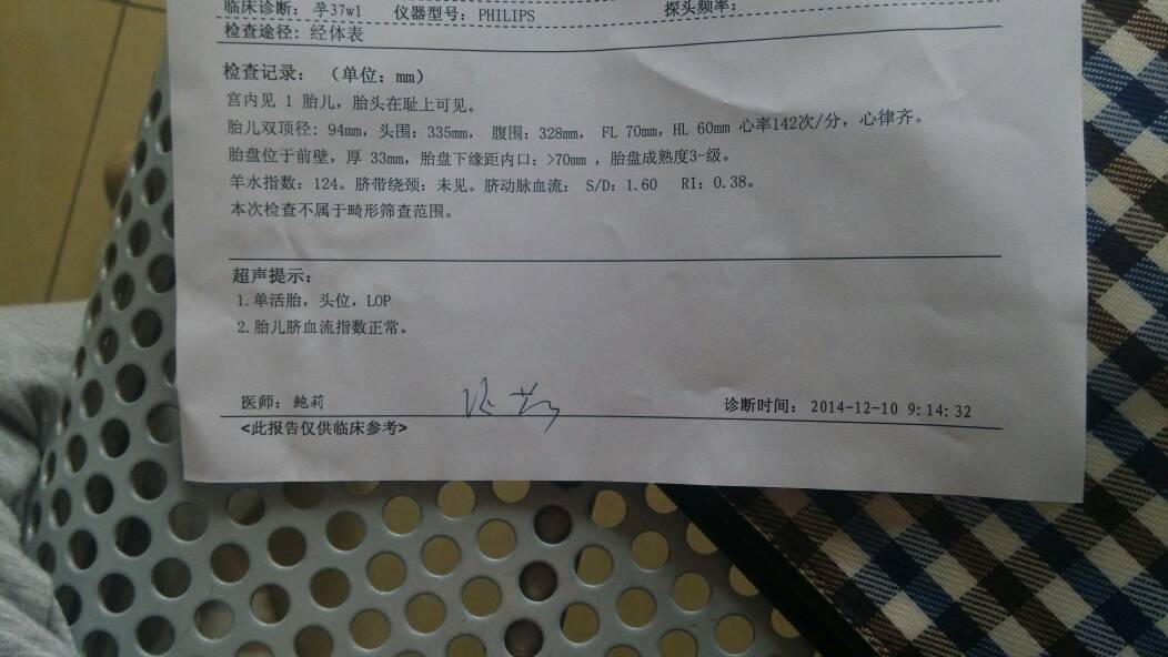 你好:看了你的b超结果,你的宝宝双顶径是94mm,按照胎儿双顶径可以推算胎儿体重,推算公式是:胎儿体重(g)=900*双顶径(cm)-5200.按照此公式可推算出你的宝宝现在体重大约是3260克。属于中等大小。如果骨盆各径线正常,胎头入盆好应该可以试产。