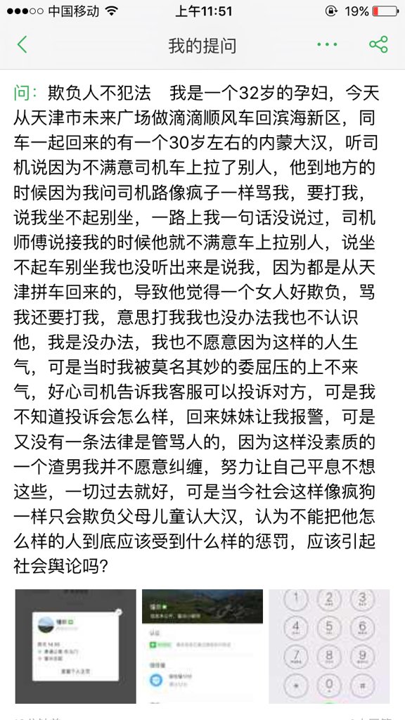 我是一个32岁的孕妇,今天从天津市未来广场做滴滴顺风车回滨海新区,同车一起回来的有一个30岁左右的内蒙大汉,听司机说因为不满意司机车上拉了别人,他到地方的时候因为我问司机路像疯子一样骂我,要打我,说我坐不起别坐,一路上我一句话没说过,司机师傅说接我的时候他就不满意车上拉别人,说坐不起车别坐我也没听出来是说我,因为都是从天津拼车回来的,导致他觉得一个女人好欺负,骂我还要打我,意思打我我也没办法我也不认识他,我是没办法,我也不愿意因为这样的人生气,可是当时我被莫名其妙的委屈压的上不来气,好心司机告诉我客服可以投诉对方,可是我不知道投诉会怎么样,回来妹妹让我报警,可是又没有一条法律是管骂人的,因为这样没素质的一个渣男我并不愿意纠缠,努力让自己平息不想这些,一切过去就好,可是当今社会这样像疯狗一样只会欺负父母儿童认大汉,认为不能把他怎么样的人到底应该受到什么样的惩罚,应该引起社会舆论吗????!?!